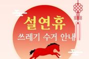 동네방네 김형규 기자 | 고양특례시 일산서구는 설 연휴 기간 주민 불편을 최소화하고 쾌적한 도시환경을 유지하기 위해 오는 14일부터 18일까지 5일간 생활폐기물 관리대책을 추진한다. 구는 ▲비상근무체계를 통한 신속한 청소행정 서비스 제공 ▲재활용품 분리배출·생활폐기물 감량 홍보 ▲연휴 기간 수거일 사전 안내 등을 실시해 올바른 쓰레기 배출을 유도할 방침이다. 이달 14일과 18일을 집중 수거일로 지정해 생활폐기물과 음식물 관련 폐기물을 정상 수거하고, 설 연휴 기간인 2월 15일부터 17일까지는 수거를 중단한다. 이에 따라 연휴 기간 중 생활쓰레기 배출 자제와 수거 일정 조정사항을 사전 홍보할 계획이다. 또한 연휴 기간, 총 17명 규모의 청소대책 상황반과 대응반을 편성·운영해 생활쓰레기 관련 민원과 무단투기 신고에 신속히 대응하고 쓰레기 투기 상습지역을 중심으로 순찰과 집중 수거를 병행한다. 구 관계자는 “설 연휴에도 주민들이 불편 없이 쾌적한 환경에서 명절을 보낼 수 있도록 청소행정 운영에 최선을 다하겠다”며 “주민들께서도 수거일을 준수하고 올바른 분리배출과 쓰레기 감량에 적극 협조해 주시길 바