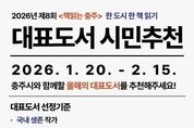 동네방네 김형규 기자 | 충주시립도서관이 시민 주도의 독서 문화 확산을 위해 2026년 제8회 '책읽는 충주' 독서 운동에 참여할 올해의 대표 도서를 공모한다. 올해로 8회째를 맞는 '책읽는 충주'는 선정된 도서를 매개로 지역사회가 소통하고 공감하는 시민 참여형 독서 캠페인이다. 대표 도서는 시민들이 제안한 추천 도서를 바탕으로 온․오프라인 투표와 도서관운영위원회 심의를 거쳐 일반 도서와 및 어린이 도서 부문에서 각 1권씩, 총 2권이 최종 선정된다. 도서 선정 기준은 △국내 생존 작가의 작품 △5년 이내 출간 도서 △3권 이상 연작 도서 제외 △(일반도서)다양한 계층이 공감할 수 있는 도서 △(어린이도서)유익하고 흥미로운 도서 등이다. 추천은 오는 9일까지 충주시립도서관 누리집을 통해 가능하며, 본관, 서충주도서관, 어린이청소년도서관, 분관, 작은 도서관에 비치된 추천서를 작성하여 제출해도 된다. 포스터에 안내된 QR코드를 활용하면 보다 쉽게 참여할 수 있다. 시 관계자는 “책읽는 충주는 기획 단계부터 시민의 목소리를 담아 완성되는 사업”이라며, “지역 사회의 독서 갈증을