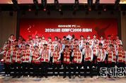 동네방네 김형규 기자 | K리그2 진출을 앞둔 김해FC2008이 올 시즌 선전을 다짐하는 출정식을 성황리에 진행하며, 역사적인 첫 걸음을 이루었다. 22일 롯데호텔앤리조트 김해에서 열린 이번 출정식은 구단주인 홍태용 김해시장과 지역 정치계 인사, 한웅수 프로축구연맹 부총재를 비롯한 축구계 인사, 스포츠트라이브 황효진 대표이사 등 후원사 관계자, 서포터즈 구신과 축구팬 등 약 400여명이 참석한 가운데 김해FC의 도전을 한마음 한 뜻으로 함께 응원하고 축하하는 자리로 마무리 됐다. 관내 청소년 댄스팀의 축하공연으로 막을 올린 출정식에서는 참석한 내외빈의 축사, 손현준 감독의 출정사와 주장단의 결의문 낭독, 선수단 소개를 비롯해, 지난달 리뉴얼한 새 엠블럼을 화려한 비쥬얼의 3D 영상으로 구현하여 공개했고, 2026시즌 공식 유니폼 킷 4종을 선수들이 실제 착용하고 나와 팬들의 뜨거운 호응을 불러일으켰다. 또한 지난 K3리그 우승 상금으로 관내 유소년 축구팀과 아동시설에 후원 물품을 전달하는 등 훈훈한 사회공헌 활동도 함께 진행됐다. 행사 후반부에서는 팬들의 질문에 선수들이 직접 대답하는 Q·A 코너를