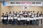 동네방네 김형규 기자 | 김제시는 20일, 2026년 제5대 김제시 어린이·청소년 의회 발대식을 개최했다고 밝혔다. 이날 발대식에는 정성주 김제시장과 서백현 김제시의회 의장을 비롯해 어린이·청소년 의원 43명과 학부모 등 50여명이 참석한 가운데 위촉장 및 배지 수여, 활동다짐문 선서, 연간계획 안내 순으로 진행됐다. 정성주 김제시장은 제5대 어린이·청소년 의회 의원들에게 위촉장을 전달했으며, 서백현 의장은 의원 한 명 한 명에게 금속 배지를 수여했다. 이어 어린이·청소년 의회 의원들은 의정활동을 위한 활동다짐문을 선서하고 올해 의정활동 계획과 포부를 공유했다. 제5대 어린이·청소년 의회는 공개모집을 통해 관내 초등학교 5~6학년에 재학중인 어린이와 관내 거주하는'청소년보호법'에 따른 19세 미만 청소년 등 총 43명으로 구성돼 의회 활동을 통해 정책에 참여하고 민주적 의사결정 과정을 직접 체험하는 등 아동의 참여권 보장 및 권리증진을 도모하게 된다. 올해 제5대를 맞이하는 어린이·청소년 의회는 발대식을 시작으로 의회 아카데미, 정책제안대회 등을 운영하며 아동 복지 증진을 위한 다양한 의정활동을 펼