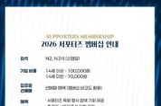 동네방네 김형규 기자 | 김천상무 공식 서포터즈 ‘수사불패’가 멤버십 회원을 모집한다. 김천상무 공식 서포터즈 수사불패가 1월 28일부터 시즌 종료 시까지 ‘2026 서포터즈 멤버십’ 회원을 모집한다. 멤버십은 선착순 200명 한정으로 운영되며, 가입비는 14세 이상 10만 원, 14세 미만 7만 원이다. 이번 서포터즈 멤버십은 ‘역대급 혜택’으로 구성됐다. 먼저 멤버십 회원은 김천상무 홈경기 시 선수들과 가장 가까운 곳에서 응원의 열기를 느낄 수 있는 서포터즈석(N2, N3구역) 입장권을 정액 7천 원에 구매할 수 있다. 동시에 가입회원 본인에 한해 서포터즈석 선예매가 가능하다. 다양한 이벤트 혜택도 있다. 서포터즈 특화 행사 참여 기회가 제공되며, 홈경기 서포터즈석 티켓 지원, 원정경기 티켓 일부 지원 혜택도 받을 수 있다. 멤버십 패키지 구성 또한 풍성하다. 서포터즈를 형상화한 멤버십 실물카드와 랜야드가 기본으로 제공되며, 14세 이상 가입자는 구단 공식 의류 후원사 켈미 바람막이를 받을 수 있다. 14세 미만 가입자는