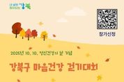 동네방네 김형규 기자 | 서울 강북구는 오는 28일 오후 2시부터 4시까지 정신건강의 날 기념 마음건강 걷기대회를 개최한다. 이번 행사는 ‘10월 10일 정신건강의 날’을 기념하여 주민들이 걷기 활동을 통해 일상 속 마음건강을 돌보고, 정신건강의 중요성에 대한 사회적 인식을 높이기 위해 마련됐다. 걷기 코스는 강북구보건소 맞은편 버스정류장에서 출발해 벌리교까지 이어지는 우이천변 1.5km 구간으로, 가을 정취를 느끼며 여유롭게 걷기 활동을 즐길 수 있다. 체험을 통해 정신건강의 중요성을 느낄 수 있도록 풍성한 프로그램도 준비됐다. 주요 프로그램으로는 △마음건강 스탬프 챌린지 △정신건강복지센터 회원들의 작품 전시 △마음건강 포토부스 및 홍보부스 등이 있으며, 행사 참여자와 완주자에게는 소정의 기념품이 제공될 예정이다. 마음건강에 관심 있는 지역주민이면 누구나 걷기대회에 참여할 수 있으며, 모집 인원은 선착순 300명이다. 참가 신청은 24일 오후 6시까지 강북구청 홈페이지 또는 강북구정신건강복지센터를 통해 가능하다. 이순희 강북구청장은 “마음을 돌보는 작은 걸음이 개인의 행복뿐 아니라 지