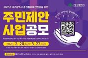 동네방네 김형규 기자 | 대구광역시는 시민의 목소리를 시정에 직접 반영하기 위해 2월 20일부터 3월 27일까지 36일간 ‘2027년도 예산편성을 위한 주민제안사업’을 공모한다. 이번 공모 규모는 총 140억 원 규모로, 공모 분야는 ▲시정 참여형(70억 원) ▲구·군 참여형(40억 원) ▲읍·면·동 참여형(30억 원) 등 총 3개 부문으로 나뉜다. 대구 시민은 물론 대구 소재 직장인과 학생이라면 누구나 참여할 수 있다. 다만, 대구시와 구·군 공무원 및 산하 출연·투자기관에 종사하는 사람은 제외된다. 제안은 주민참여예산 누리집과 이메일, 팩스, 우편 및 방문 접수를 통해 가능하다. 대구시는 참여자 가운데 추첨을 통해 모바일 상품권을 지급하며, 향후 투표를 통해 우수사업으로 선정된 제안자에게는 대구광역시장 표창을 수여할 계획이다. 접수된 사업은 사업부서 검토와 주민참여예산위원회의 숙의·심사, 주민투표 및 총회 승인을 거쳐 선정되며, 시의회 예산심의·의결을 통해 2027년 주민참여예산 사업으로 최종 확정된다. 한편, 대구시는 지난해 주민제안사업 공모를 통해 ▲불로고분공원