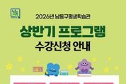 동네방네 김형규 기자 | 인천시 남동구 평생학습관은 구민의 자기 계발과 지적 성장을 위해 오는 24일부터 ‘2026년 상반기 평생학습 프로그램’ 학습자를 모집한다고 20일 전했다. 상반기 프로그램은 3~5월까지 운영되며, 일상의 활력을 더하고 실질적인 역량을 강화할 수 있는 실용적인 강좌들로 꾸려졌다. 특히, ‘2025년 평생교육 강사학교’ 과정을 이수한 강사들이 지역사회와 시민의 삶을 주제로 직접 기획⋅개발한 강좌들이 다수 개설됐다. 주요 강좌로는 ▲남동구의 색(色)다른 이야기 ▲나의 감정을 안아주는 예술이야기 ▲생성형 AI로 만드는 나의 영상 콘텐츠 ▲그림책과 공예 테라피로 나를 찾는 ‘다시, 봄’ 등 모두 4개 과정이 운영된다. 이와 함께 전 연령층의 학습 수요를 반영한 다양한 강좌도 운영된다. ▲시니어(65+) 스마트폰 입문 클래스 ▲바리스타 2급 자격과정 ▲오뒷세우스 깊게 읽기 ▲장애인과 비장애인이 함께하는 생태탐방 등 실용성과 인문적 소양을 아우르는 프로그램이 준비돼 있다. 수강 신청은 남동구평생학습관 홈페이지에서 선착순으로 진행되며, 남동구민 또는 남동구 내 직