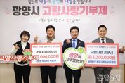 동네방네 김형규 기자 | 광양시는 6일 광양시청에서 광양 출신 향우 2명이 고향에 대한 애정과 응원의 마음을 전하는 ‘고향사랑기부금 전달식’을 개최했다고 밝혔다. 이날 전달식에는 미라클YT펌프 원영태 대표와 광양본가기정떡 박용무 대표가 참석해 각 100만 원씩 총 200만 원의 고향사랑기부금을 시에 전달했다. 이번 기부는 지방재정 확충과 지역경제 활성화를 목적으로 추진되고 있는 고향사랑기부제의 취지에 공감한 기부자들이 자발적으로 참여해 더욱 의미를 더했다. 특히 원영태 대표는 3년 연속으로 고향사랑기부제에 동참하며 꾸준한 기부 실천을 통해 지역 사랑과 나눔 문화 확산에 앞장서고 있다. 원영태 대표는 “고향 광양에 대한 마음을 담아 지역 발전에 조금이나마 보탬이 되고자 참여했다”며 “이번 기부가 고향사랑기부제의 취지를 널리 알리고, 더 많은 시민과 향우의 참여로 이어지는 계기가 되길 바란다”고 말했다. 박용무 대표는 “지역과 함께 성장해 온 만큼, 앞으로도 지역과 상생할 수 있는 다양한 방법을 지속적으로 고민하겠다”고 밝혔다. 광양시 관계자는 “광양 발전을 위해 늘 아낌없는