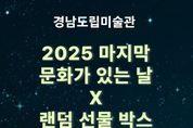 동네방네 김형규 기자 | 경남도립미술관은 12월 31일 ‘문화가 있는 날’을 맞이해 연말을 함께 즐길 수 있는 특별 이벤트를 마련한다고 밝혔다. 이날 미술관은 전시실을 무료 개방하며, 관람 시간 또한 오후 8시까지 연장 운영된다. 오후 6시부터는 미술관을 찾은 관람객 중 선착순 30명에게 참여 기회가 주어지는 ‘행운권 추첨 이벤트’가 진행되며, 참여자에게는 랜덤 선물 박스 등 다양한 경품이 증정된다. 이번 행사는 ‘문화가 있는 날’을 통해 관람객이 미술관을 보다 가깝게 느끼고, 한 해를 예술과 함께 마무리할 수 있도록 기획됐다. 미술관 관계자는 “2025년을 함께 해준 지역민들에게 감사의 마음을 전하며, 작은 선물과 예술의 경험이 따뜻한 연말 추억이 되길 바란다”라고 전했다. 한편, 이번 야간 개장에서는 현재 진행 중인 환경을 주제로 한 체험형 전시《테라폴리스를 찾아서》와 함께《현대옻칠예술: 겹겹의 시간》도 관람가능하다.