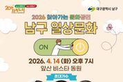 동네방네 김형규 기자 | 대구 남구는 지역 주민들에게 일상 속 문화 향유 기회를 확대하고, 지역 예술가들의 공연 활동을 지원하기 위해 ‘2026 찾아가는 문화공연’ 을 개최한다. 관내 신규 입주 공동주택을 대상으로 공연을 희망하는 아파트 단지를 선정하였으며, 오는 4월 14일(화) 앞산비스타동원 아파트에서 첫 공연을 진행할 예정이다. 저녁 7시에 열리는 ‘앞산비스타동원 음악회’에서는 인기 개그맨 김재롱이 사회를 맡고, 지역 가수 이새벽과 미스트롯 4 출연자 장혜리 가수가 공연을 펼친다. 또한, 아파트 입주 후 처음으로 열리는 주민 참여 행사인만큼 입주자 대표회에서도 다양한 경품과 선물을 준비하여 주민 화합의 장을 만들 예정이다. 조재구 남구청장은 “대규모 축제나 행사도 중요하지만, 주민들이 사는 가까운 동네에서 편하게 문화예술을 접할 수 있도록 찾아가는 문화행정을 적극 추진하겠다.”라며, “아파트로 찾아가는 음악회를 통해 주민들이 일상에서 소소한 행복을 느끼며 힐링할 수 있기를 바란다.”라고 전했다. ‘찾아가는 문화공연’에 대한 문의는 남구 문화관광과 문화예술팀으로 연락하면 안내받을 수 있다.