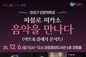 동네방네 김형규 기자 | 마포구는 오는 12월 6일 오전 10시부터 12시까지 마포중앙도서관 6층 마중홀에서 연말 인문학특강 ‘파블로 피카소, 음악을 만나다(아트&클래식 콘서트)’를 개최한다. 이번 특강은 전문 도슨트와 정상급 클래식 연주자들이 함께해 예술과 음악이 어우러진 특별한 문화 경험을 구민들에게 제공하고자 마련됐다. 프로그램은 국민대 미술이론 박사과정을 밟고 바티칸·오르세 박물관 등에서 도슨트로 활동한 이창용 도슨트가 강연을 맡아 파블로 피카소의 삶과 그의 작품 세계를 쉽고 흥미롭게 풀어낸다. 전문 해설을 통해 피카소의 예술적 감각과 시대적 배경, 작품에 담긴 메시지를 입체적으로 이해할 수 있도록 구성했다. 파블로 피카소 작품 해설과 함께 정상급 클래식 연주자들의 무대가 어우러진다. 이소란·변현정 바이올리니스트, 이신규 비올리스트, 장우리 첼리스트, 이현진 피아니스트 등 국내 음악계에서 활발히 활동 중인 연주자들이 참여해 모차르트 디베르티멘토 라장조, 쇼팽 녹턴 2번, 알렉산드로 보로딘 현악 4중주 2번 3악장, 모리스 라벨의 죽은 왕녀를 위한 파반느 등 다채로운 곡을 선보인다